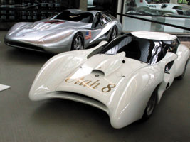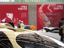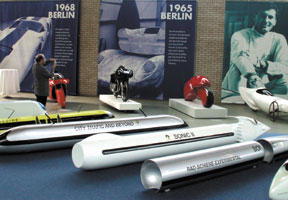 Colani workscape showing BMW racer, Ferrari, space camera and transportation studies