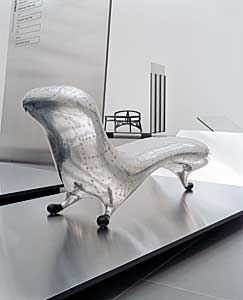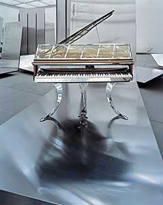 Die Spiegelung der Aluminiumplatten erweitert die Aura der Objekte, die abgewinkelten Seitenteile schaffen ein eigenes Umfeld, das dennoch Sichtverbindungen und Dialoge zu anderen Exponaten ermöglicht. |